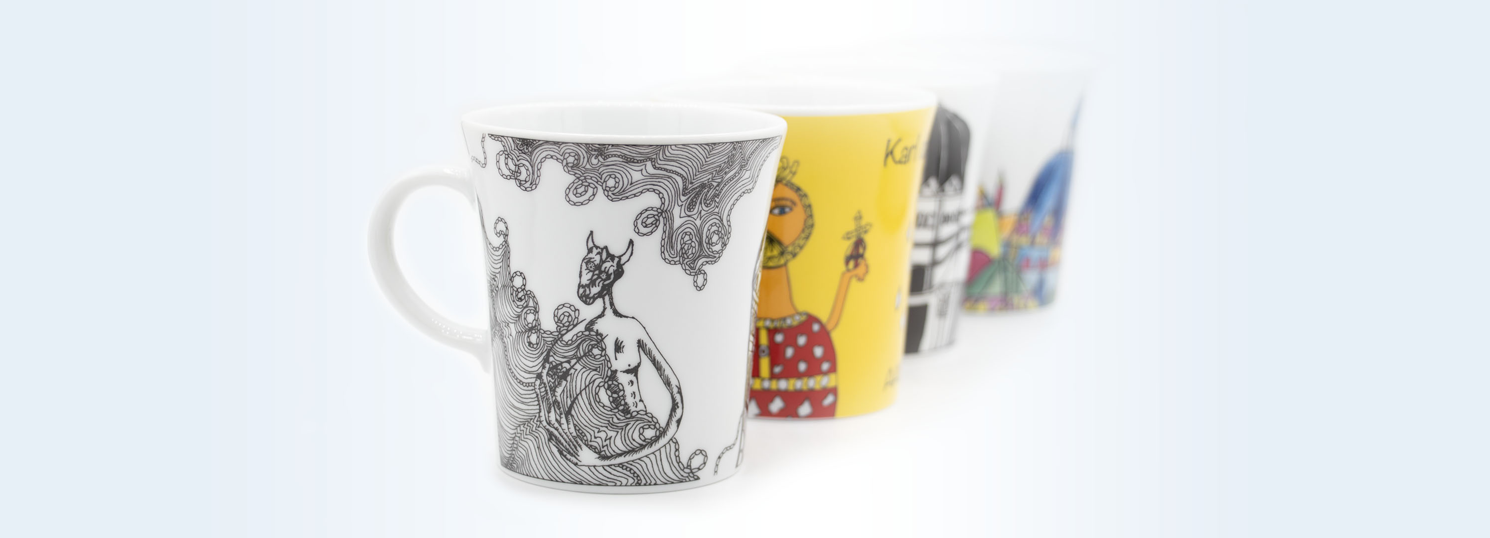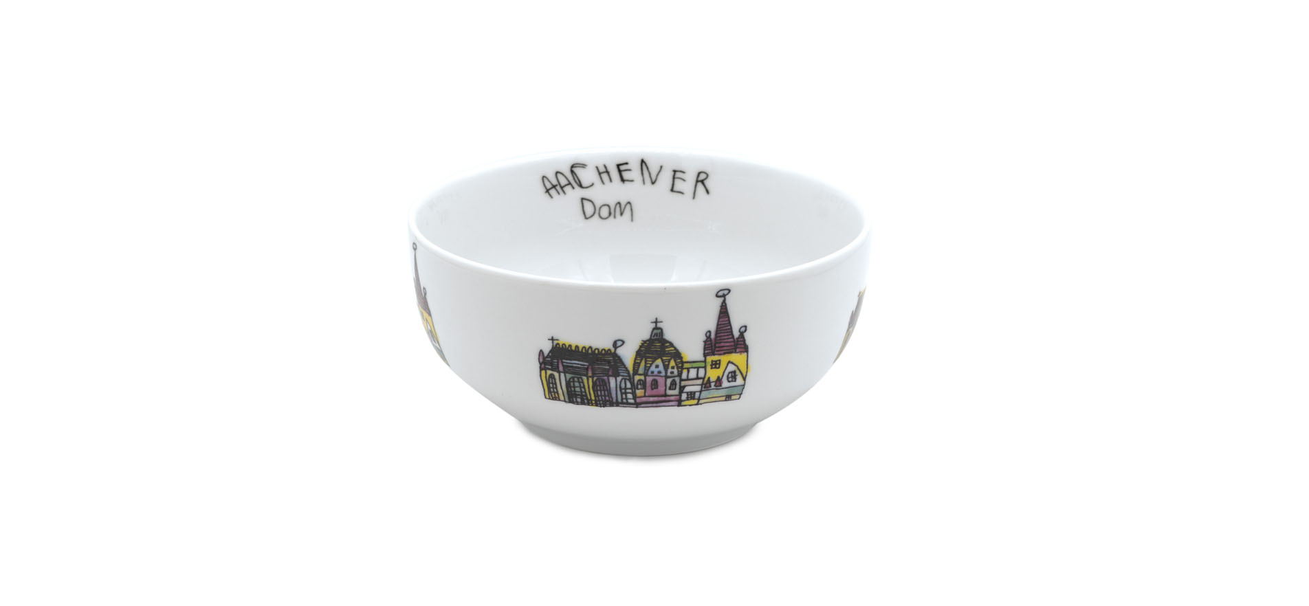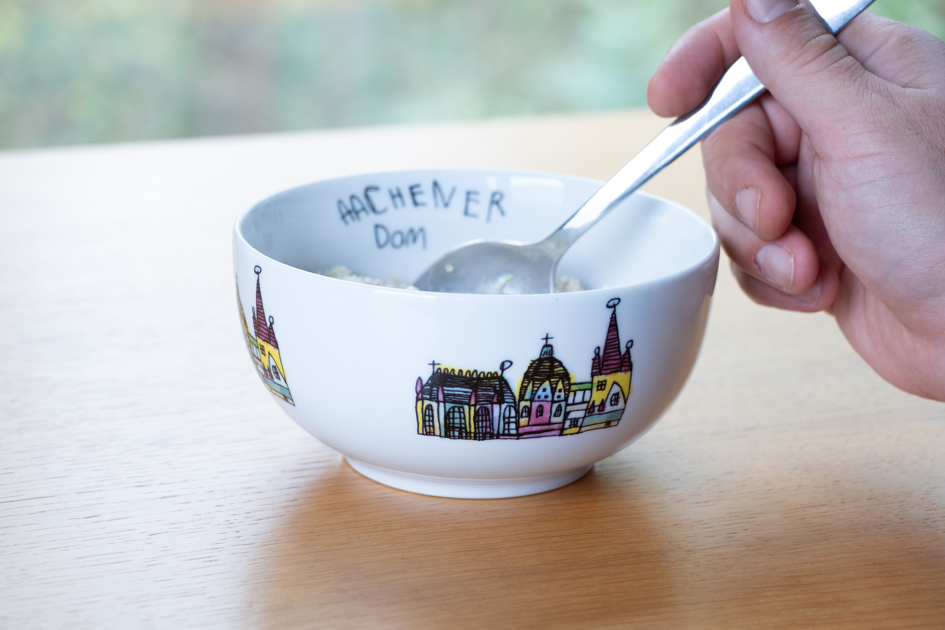 Müslischalen mit handgemaltem Bild des Aachener Doms oder stylischen Früchten