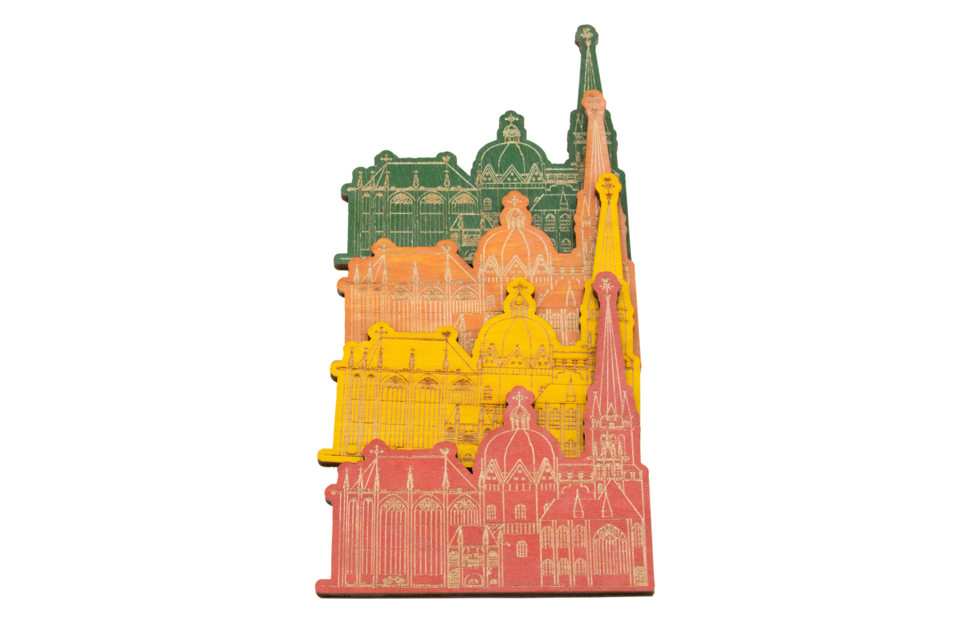 Die vielseitigen Holzklötze bilden in einer bestimmten Anordnung den Aachener Dom, aber selbstverständlich lassen sich auch weitere kreative Formen damit zusammensetzen.