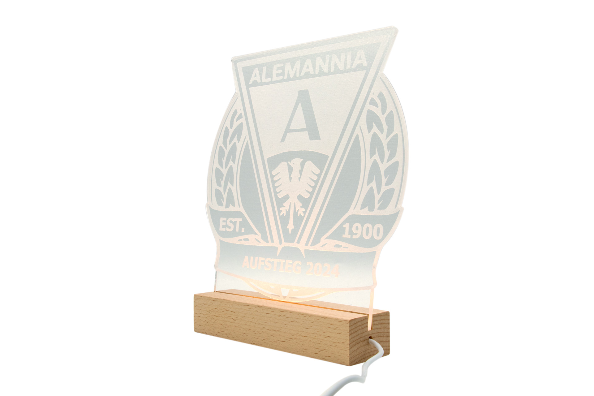 Unsere Sozialpartnerschaft mit Alemannia Aachen ist etwas ganz besonderes und dies möchten wir mit besonderen Aufstellern feiern. Zeigen Sie Ihre Liebe zu Alemannia Aachen mit verschiedenen Designs und motivierenden Sprüchen (#ZESAME, Aufstieg 2024, Gott will es) auf einer durchsichtigen Platte aus Acrylglas. Die Gesamtmaße belaufen sich auf B 15cm, T 4,4cm, H 22cm. Beleuchtet wird Ihr neues Schmuckstück durch ein Lichtelement im Holzständer des Aufstellers. Dieses kann nach Ihren individuellen Wünschen in unterschiedlichen Farben leuchten. Einfach per