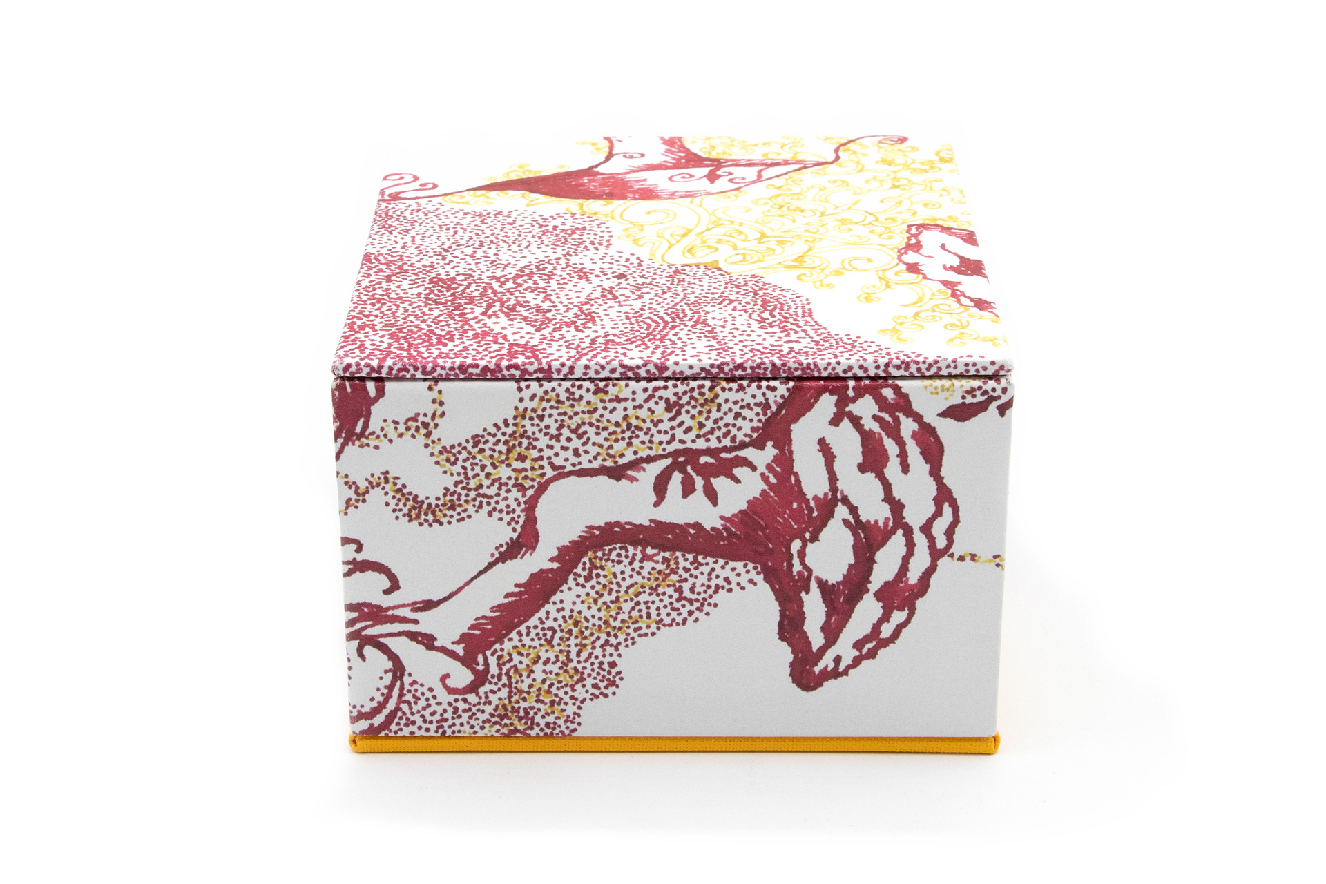 Geben Sie Ihrer Schmucksammlung ein Zuhause! Die Schmuckdose im farbenfrohen Design bietet genug Platz für Ihre liebsten Stücke. Dazu können Sie aus drei Ausführungen wählen. Klein: B 9,7 cm, H 9,7 cm, T 6,6 cm, Mittel: B 11,4 cm, H 11,4 cm, T 7,4 cm und Groß: B 13,5 cm, H 13,5 cm, T 8,4 cm. Sie sehen, es ist für jede Sammlung etwas dabei. Die rechteckige Bauweise ist dabei schlicht aber elegant und äußerst robust. Der passgenau gefertigte Deckel sitzt perfekt, um Ihren Schmuck und weitere Gegenstände sicher zu verwahren, lässt sich aber komfortabel genug öffnen und schließen, damit sie ihren Schmuck im Handumdrehen an- oder ablegen können. Erfreuen Sie sich zudem an dem selbstgestalteten fungalen Design in warmen Rot- und Gelbtönen. Das handgemalte Muster setzt sich über die Seitenwände und den Deckel fort – so ist Ihre neue Schmuckdose in jedem Fall ein absoluter Hingucker und der ideale Platz für Ihre Ringe und Ketten.
